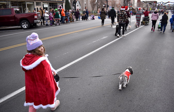 MEDINA – This dog carries a Santa during the Pets on Parade today at noon in Medina. This year there were about 30 dogs in the procession, the most since pets were welcomed in a parade leading Santa to downtown Medina.